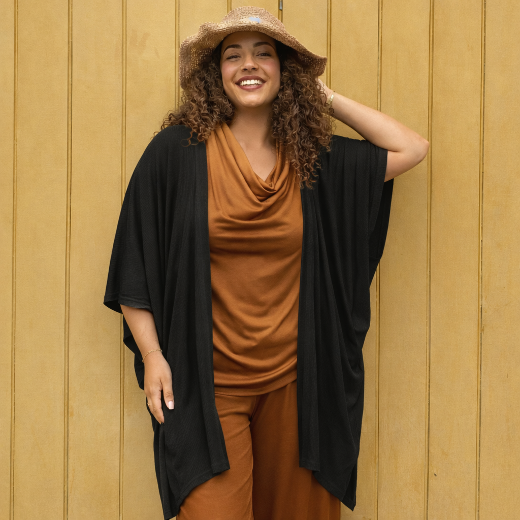 With its one size fits all versatility and soft bamboo rib, this cape is perfect for making a statement or relaxing in comfort. Take it on a getaway and travel in style - this Australian-made item will be your go to piece. Only 10 made. Once they have sold out that it !